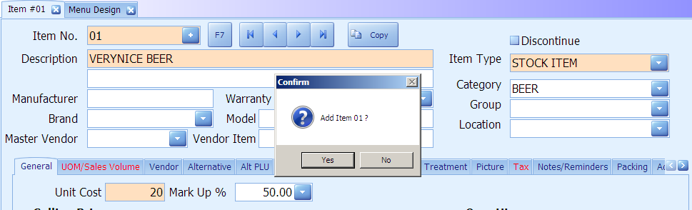 7. Click yes to confirm add item.